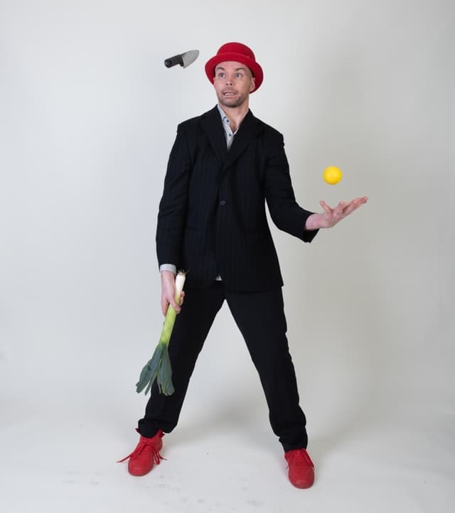 Kvällens konferencier Douglas är en frilansande cirkusartist från Falköping, utbildad på Cirkuspiloterna via Cirkus Cirkör. Med jonglering och akrobatik som grund har han uppträtt i allt från gympasalar till ombord lyxkryssare – ofta med en komisk twist och en känsla av att vad som helst kan hända.